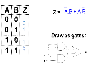 (XOR). True if the two inputs are the different, false if the two inputs are