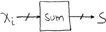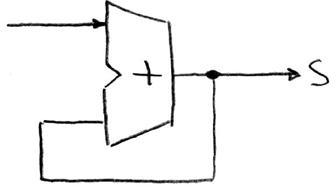 Combinational element we need: an Adder, S = X + Y. Since S is a pure function of X and Y, this can be done in a combinational circuit, itself the component with the plus sign on it in the next diagram, but with X and Y coming into the two multibit inputs.
