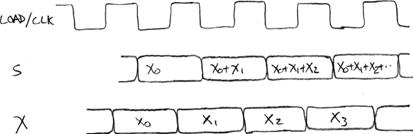At the first clock falling edge, X0 and 0 are on the adder inputs, so S = X0.