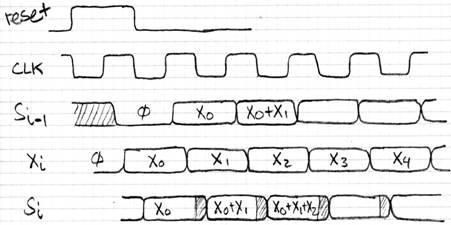 4. Consider the summing: it ignores the clock, just follows the Si-1 and Xi inputs, with the little delay shown. You can mark bars of stable input value on these inputs, and the corresponding interval (by intersection of the two input intervals) on the Si-1 output.