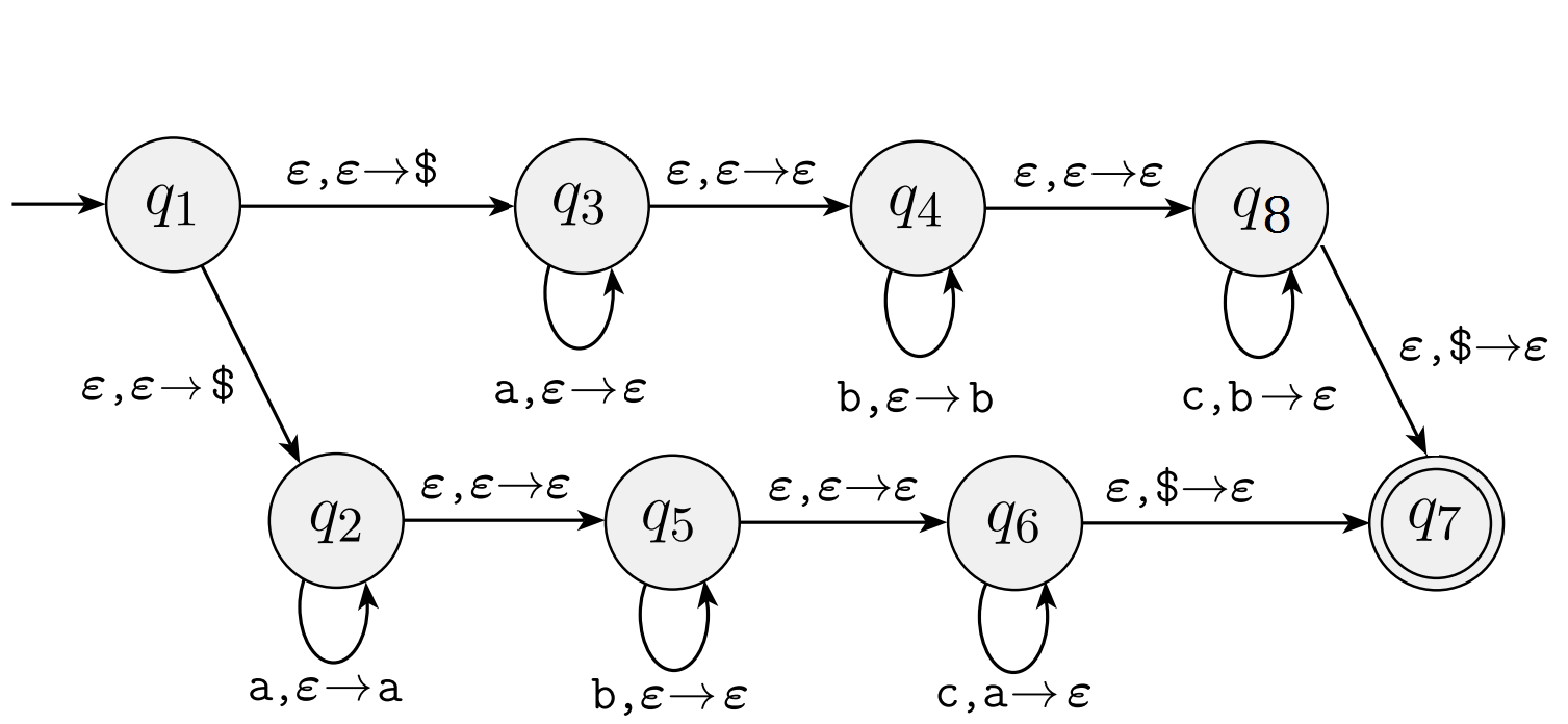 Give a CFG for the language recognized by this PDA (this problem is easier if you break it down into smaller problems) (alternatively, if you use the PDA-to-CFG conversion algorithm from lecture / the textbook that would work but could be a much more complicated approach, so make sure your answer is clear and understandable if you take this approach).